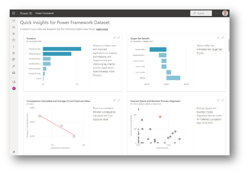 If you’re not sure where to start with the analysis of your data, you can ask Power BI to find interesting trends and patterns. These are presented in the form of visuals that are called Insights. Power BI quickly searches different subsets of your dataset, applying a set of sophisticated algorithms to discover those potentially interesting insights.