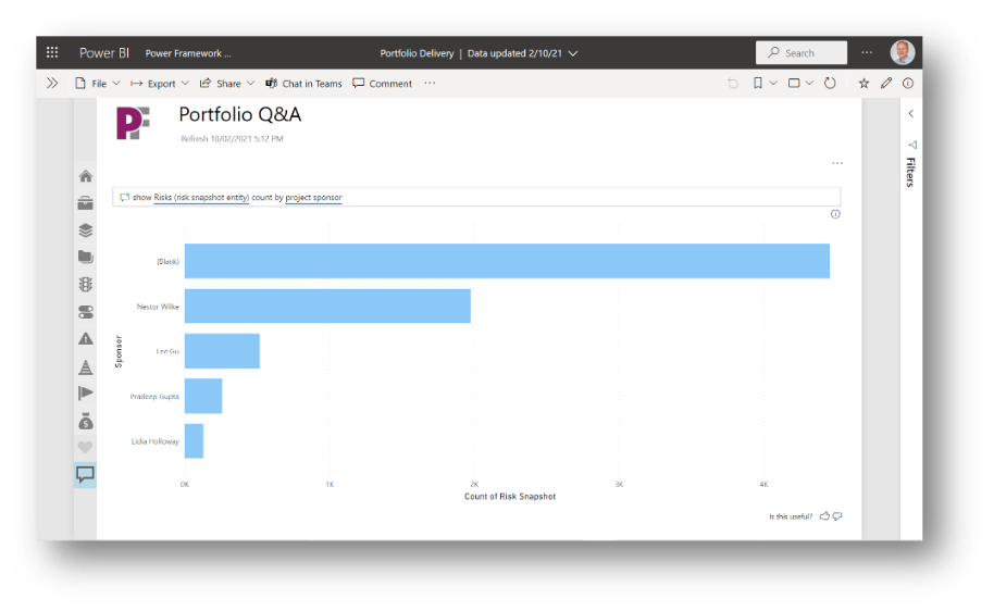 Power BI’s Q&A feature uses the latest artificial intelligence and natural language processing technologies, so you can ask a question in the way you’d say it naturally. The Q&A feature searches your data in an instant to bring you speedy and accurate answers.