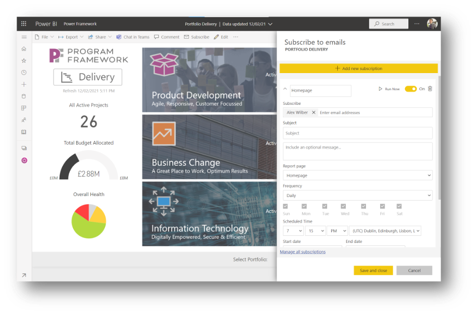 With Power BI’s subscriptions it is easy for you to keep up-to-date with the latest report updates. Subscriptions allow you to have a mail sent with an image of the report and link to the report in the service – you choose the frequency of the email.