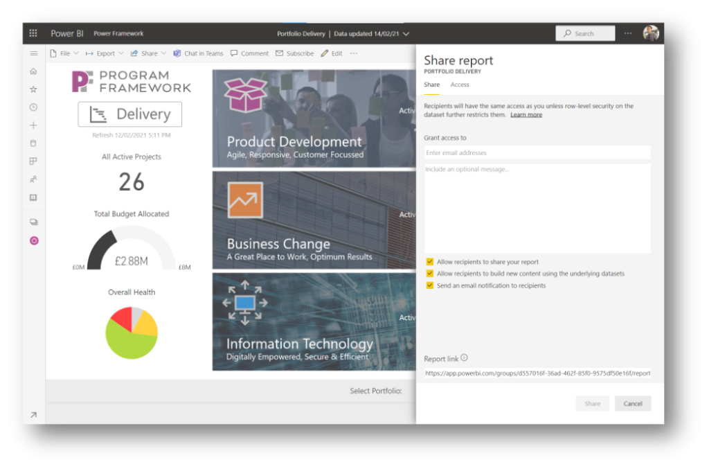 It is easy to share reports with people outside your organisation – just grant access to their external email addresses. You can trigger an email to send them the link to the report, and also control if they should be allowed to share it with others or if this link is personal to them. Do note though that the recipient must be licensed for Power BI in their own Microsoft tenant.
