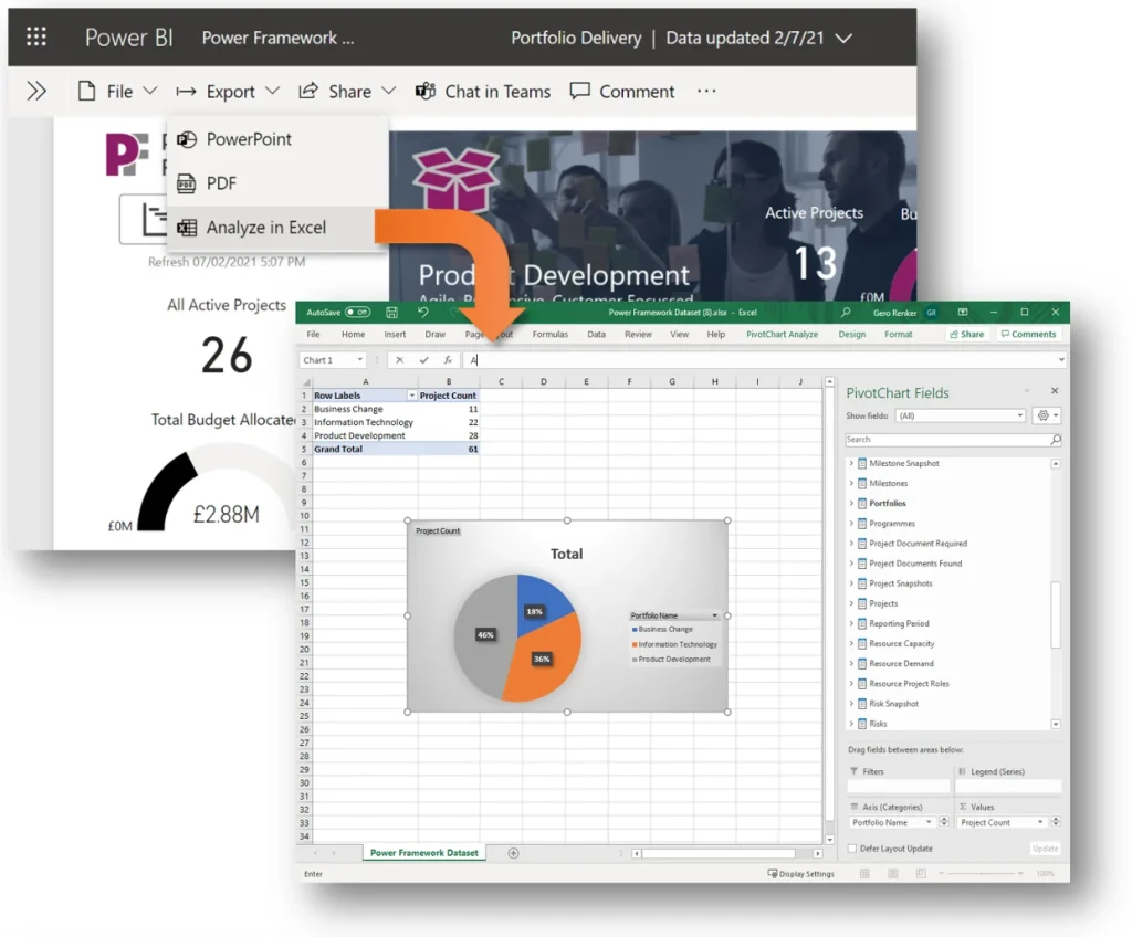 It is easy to bring Power BI datasets into Excel, and then view and interact with them using PivotTables, charts, slicers, and other Excel features. This is a great way to empower data analysts who are most comfortable with Excel and ensures they won’t work with data that is out of date or different to the ‘official’ Power BI dataset. Excel workbooks consuming this data can be created once and then stay connected to refresh data as required.